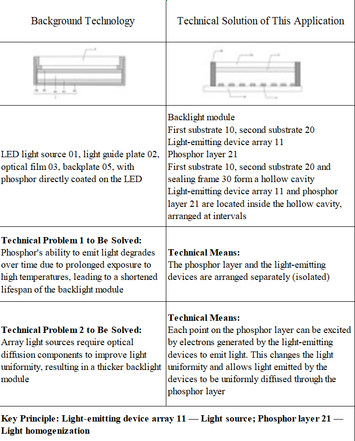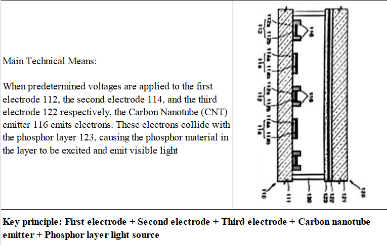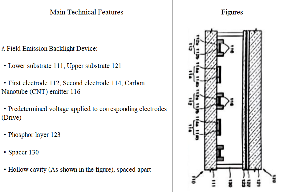 인용참증1(CN1637511A)은 전계 방출형 백라이트 유니트 및 그 구동 방법과 하부 패널의 제조 방법을 공개하였다. 구체적으로 하부 기판111, 상부 기판121, 제1전극112, 제2전극114, 전극에 각각 소정의 전압을 인가(구동)하는 탄소나노튜브(CNT) 에미터 116, 형광층123, 스페이서130 등 특징을 공개하였다.